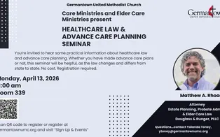 Monday, April 13 | 11:00 amYou’re invited to hear some practical information about healthcare law and advance care planning. Whether you have made advance care plans or not, this seminar will be helpful, as the law changes in state and from state to state.Matthew A. Rhoads – Attorney Estate Planning