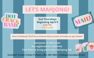 2nd ThursdaysBeginning April 96:00 PMThe HuddleNew to Mahjong? We’ll have someone there to teach and help you get started!Everyone is welcome!No registration required.Feel free to bring your own Mahjong SetQuestions? Contact Chesley Porteous • 901-268-4884 • chesleyporteous@gmail.com