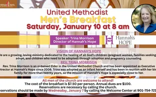 Saturday, January 10 at 8 amSpeaker: Trina MorrisonDirector of Hannah’s HopeVision of Hannah’s HopeWe are a growing, loving ministry dedicated to the healing of all God’s children (pregnant women, families seeking to adopt, and children who need to be adopted) through adoption and pregnancy counseli
