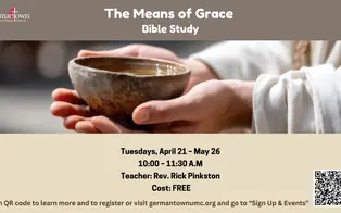 The Means of GraceTuesdays, April 21 – May 2610:00 – 11:30 A.MTeacher: Rev. Rick Pinkston Cost: FREEOne phrase you might hear United Methodists use often is “Means of Grace”, but what does that phrase mean? The Means of Grace are vital practices we engage in every day to deepen our relationship with