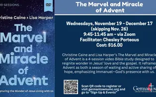 The Marvel and Miracle of Advent Recapturing the Wonder of Jesus Living With UsWednesdays, November 19 – December 17 (skipping Nov. 26) 9:45-11:45 am; via Zoom.Facilitator: Chesley Porteous; Cost: $16.00.Join authors Christine Caine and Lisa Harper this Advent season for a four-session video Bible s