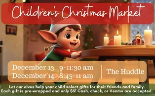 Saturday, December 13 I️ 9-11:30 am Sunday, December 14 I️ 8:45-11:00 amLet our elves help your child select gifts for their friends and family. Each gift is pre-wrapped and only $5! Cash, check, or Venmo are accepted.