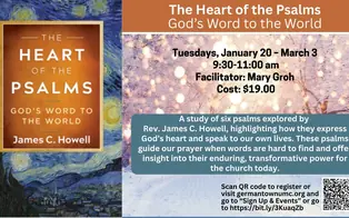The Heart of the Psalms Understanding God’s Word to the WorldTuesdays, January 20 – March 3 9:30-11:00 amFacilitator: Mary Groh Cost: $19.00A study of six psalms explored by Rev. James C. Howell, highlighting how they express God’s heart and speak to our own lives. These psalms guide our prayer when